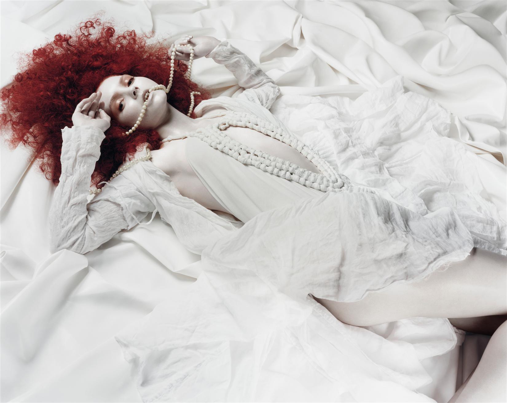 A blonde with red lips with a white pearl ornament in her handA blonde with red lips with a white pearl ornament in her hand