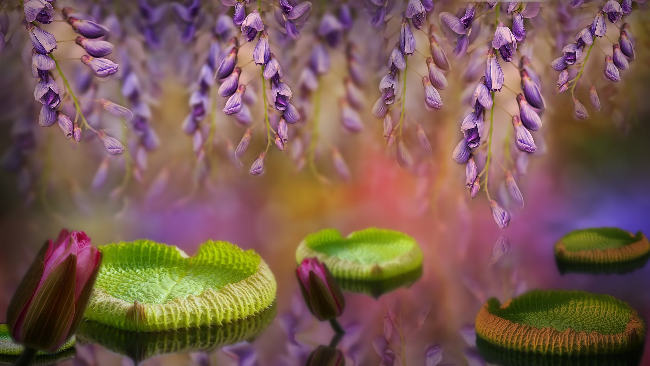 A girl in a white dress in a pond with water lilies with a bright flower in her hairA girl in a white dress in a pond with water lilies with a bright flower in her hair