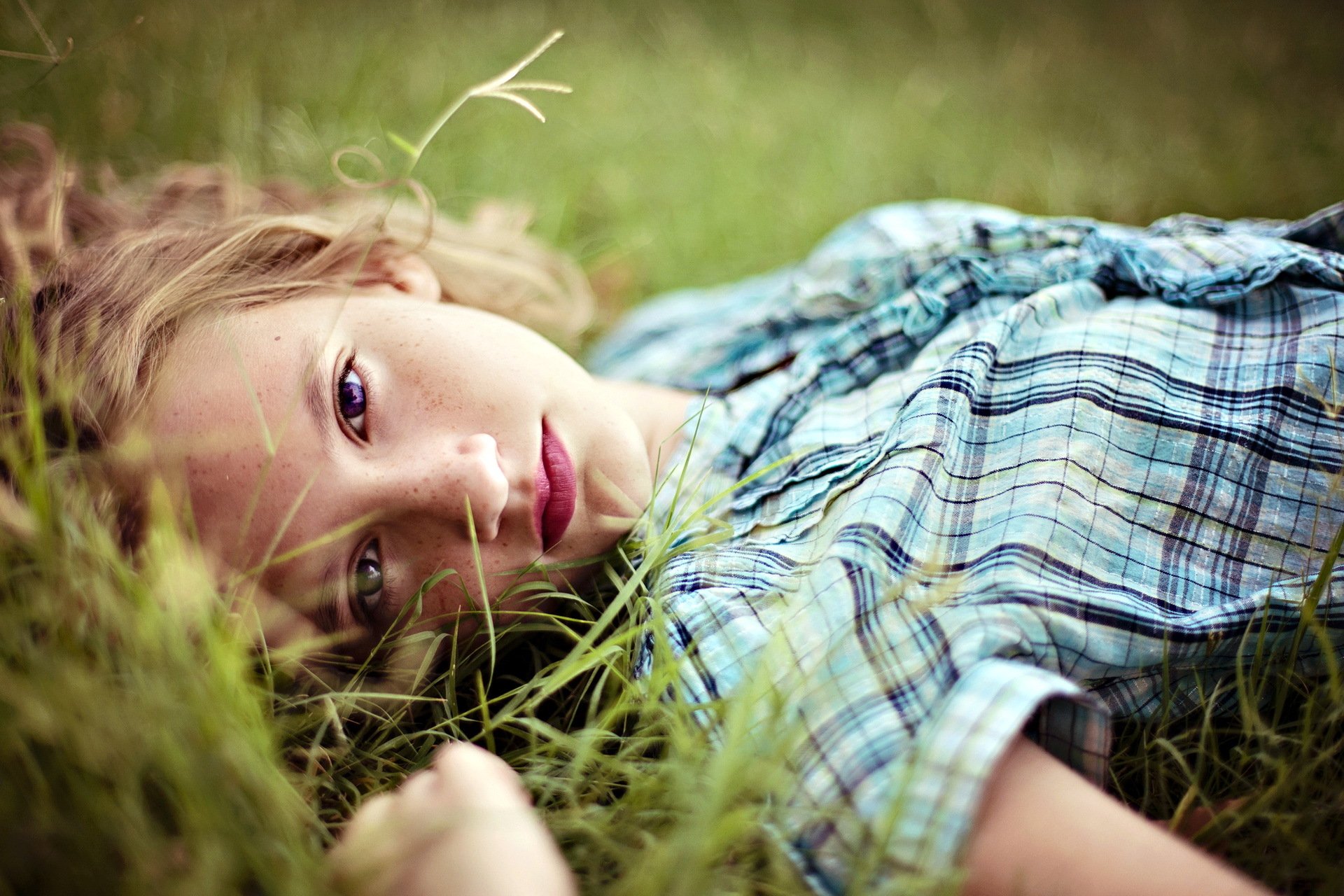 The blonde girl in the portrait is lying on the grass, thoughtfully looking at the cameraThe blonde girl in the portrait is lying on the grass, thoughtfully looking at the camera