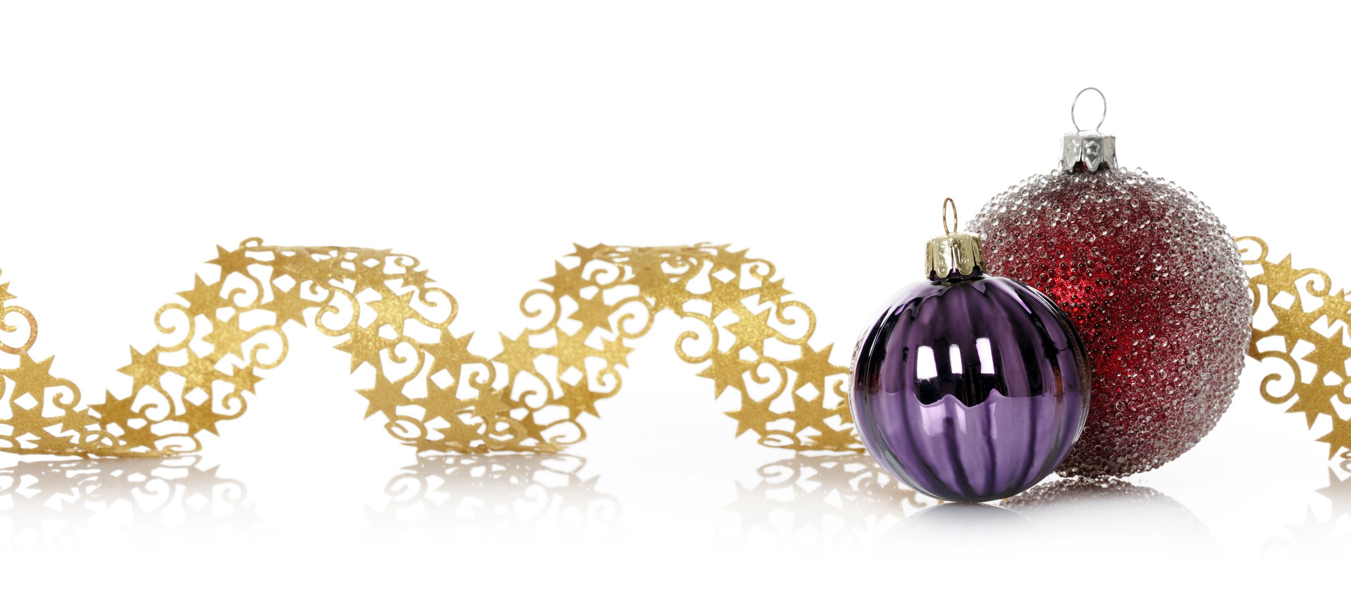 New Year's gift in a white box with a red ribbon among Christmas balls and stars in a gold design on a white background