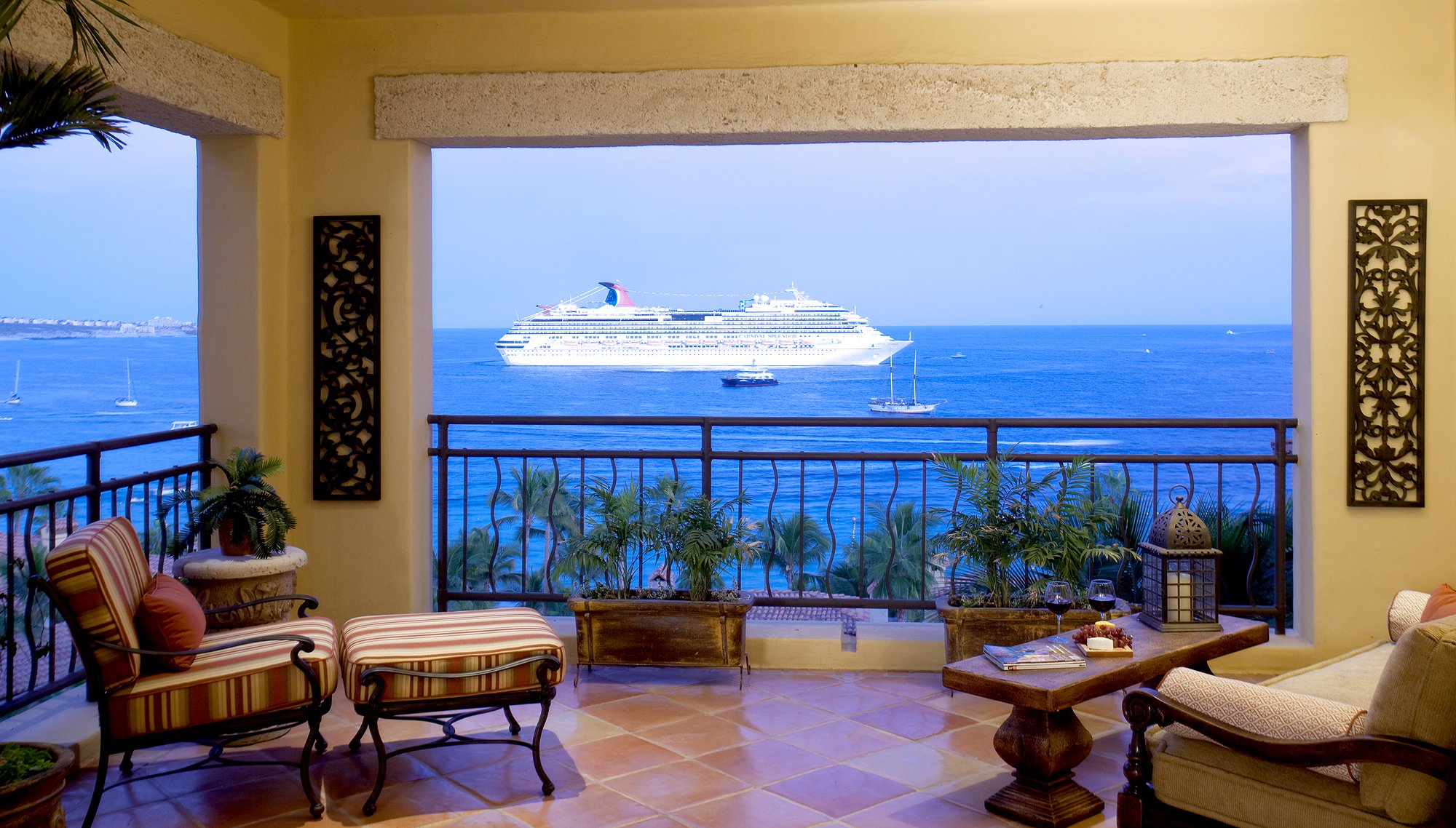 Evening palm trees, armchairs, candles, tables