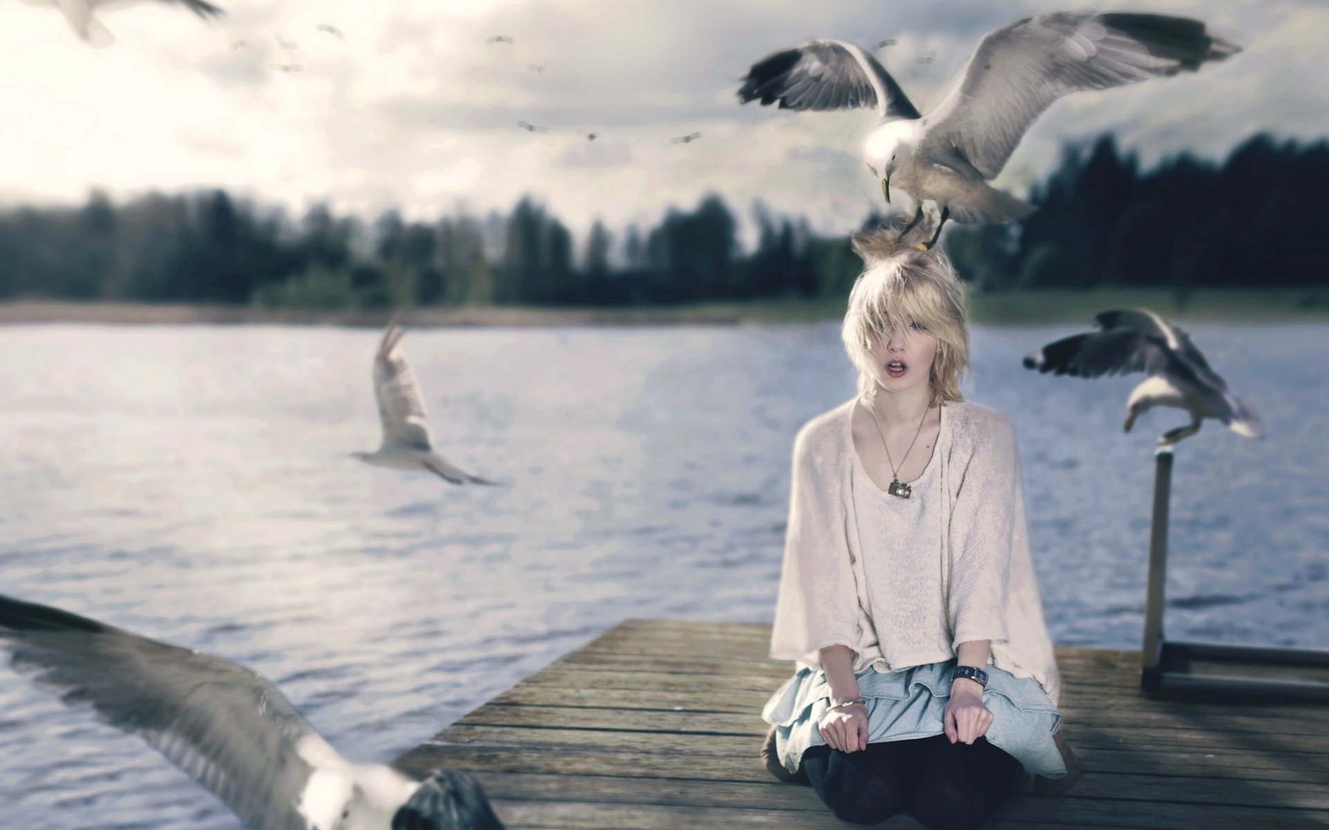 A simple photo of a girl and birds