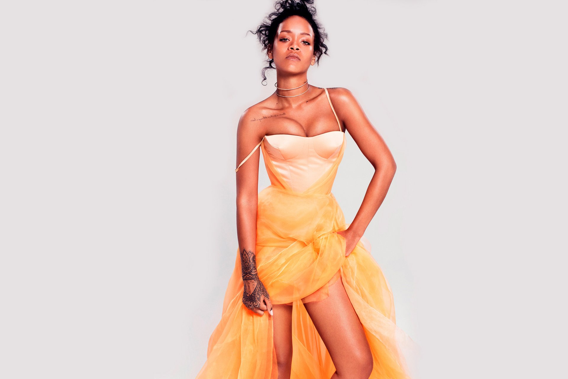 Photo session of singer Rihanna in a yellow dress