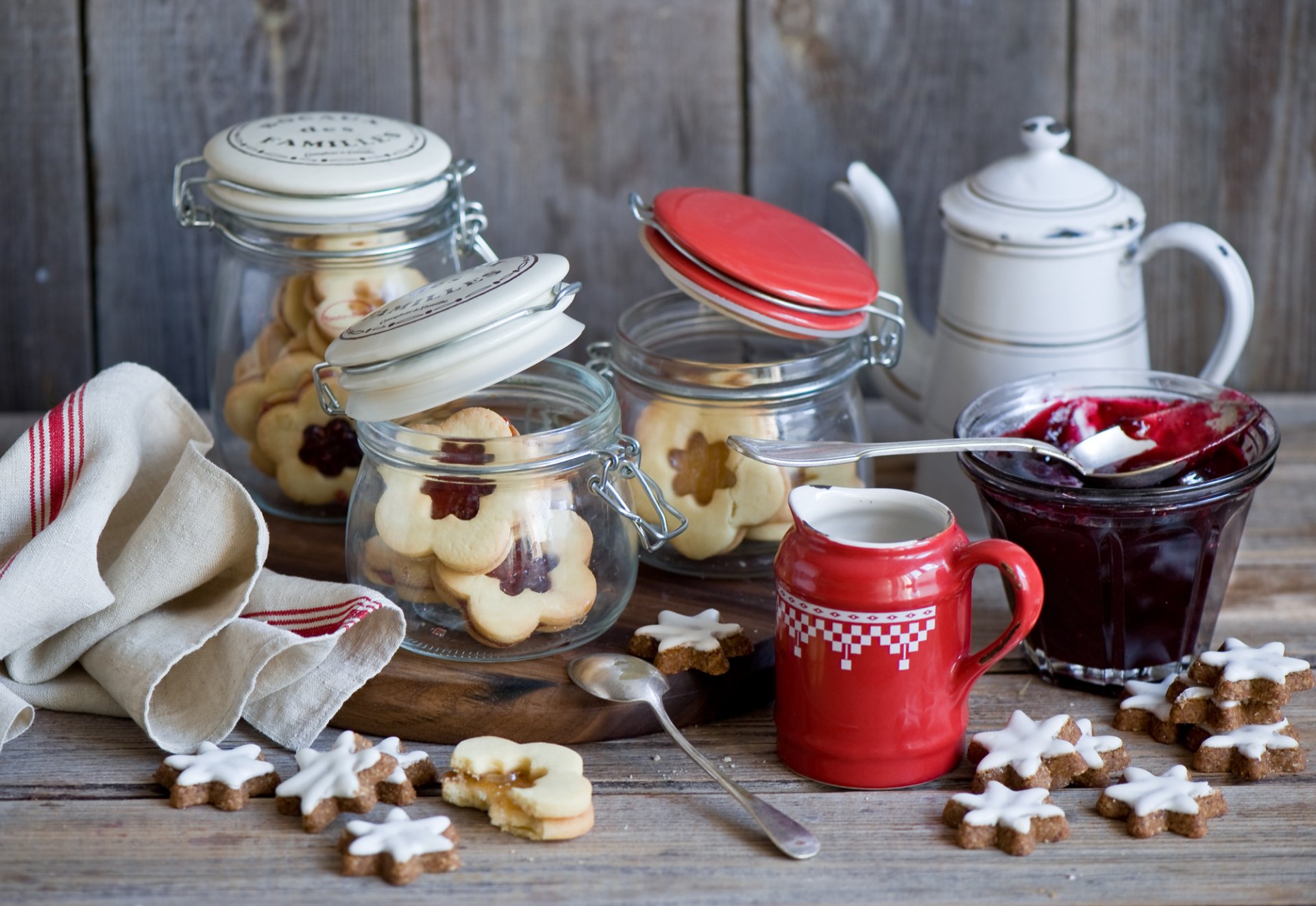 On the table there are jars of jam and a deep plate with raspberriesOn the table there are jars of jam and a deep plate with raspberries