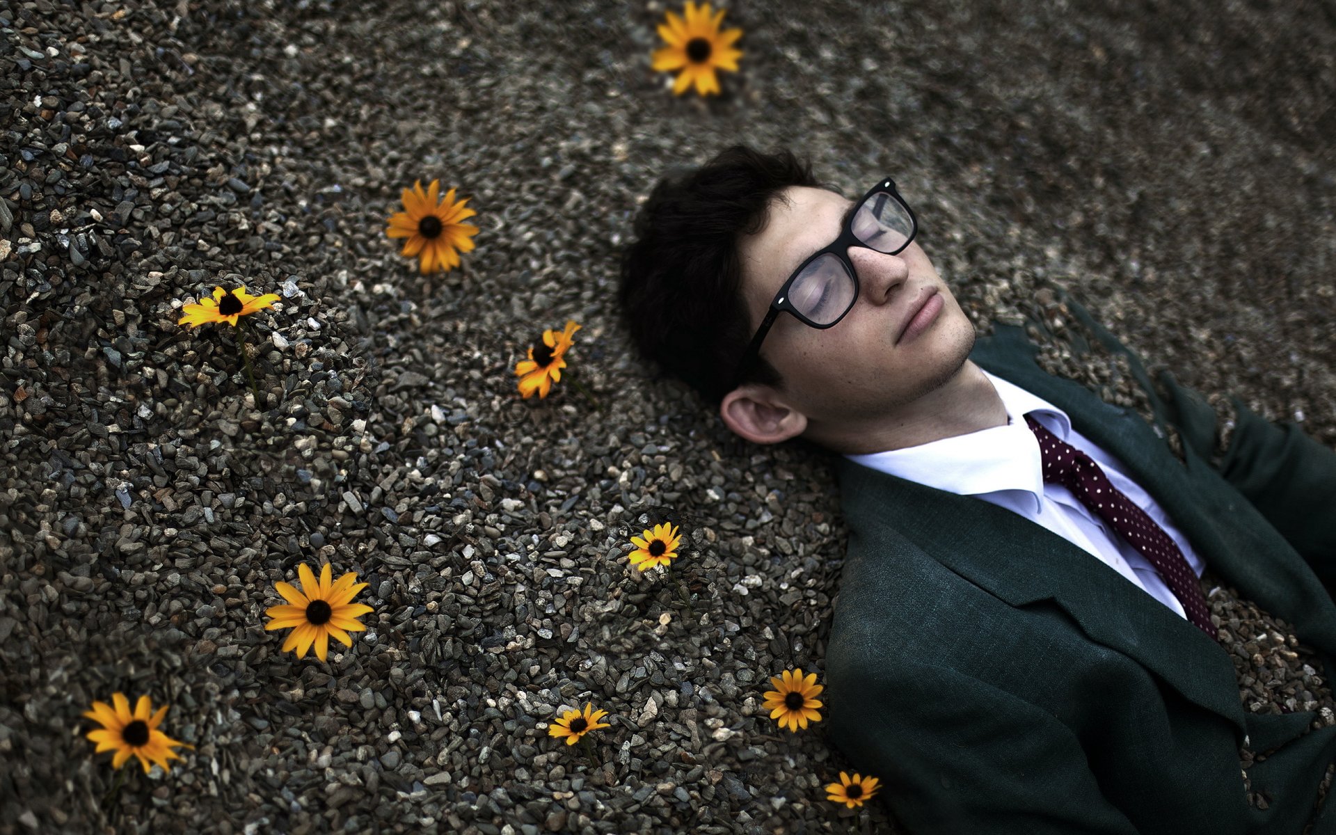 A man lying in stones with orange flowers