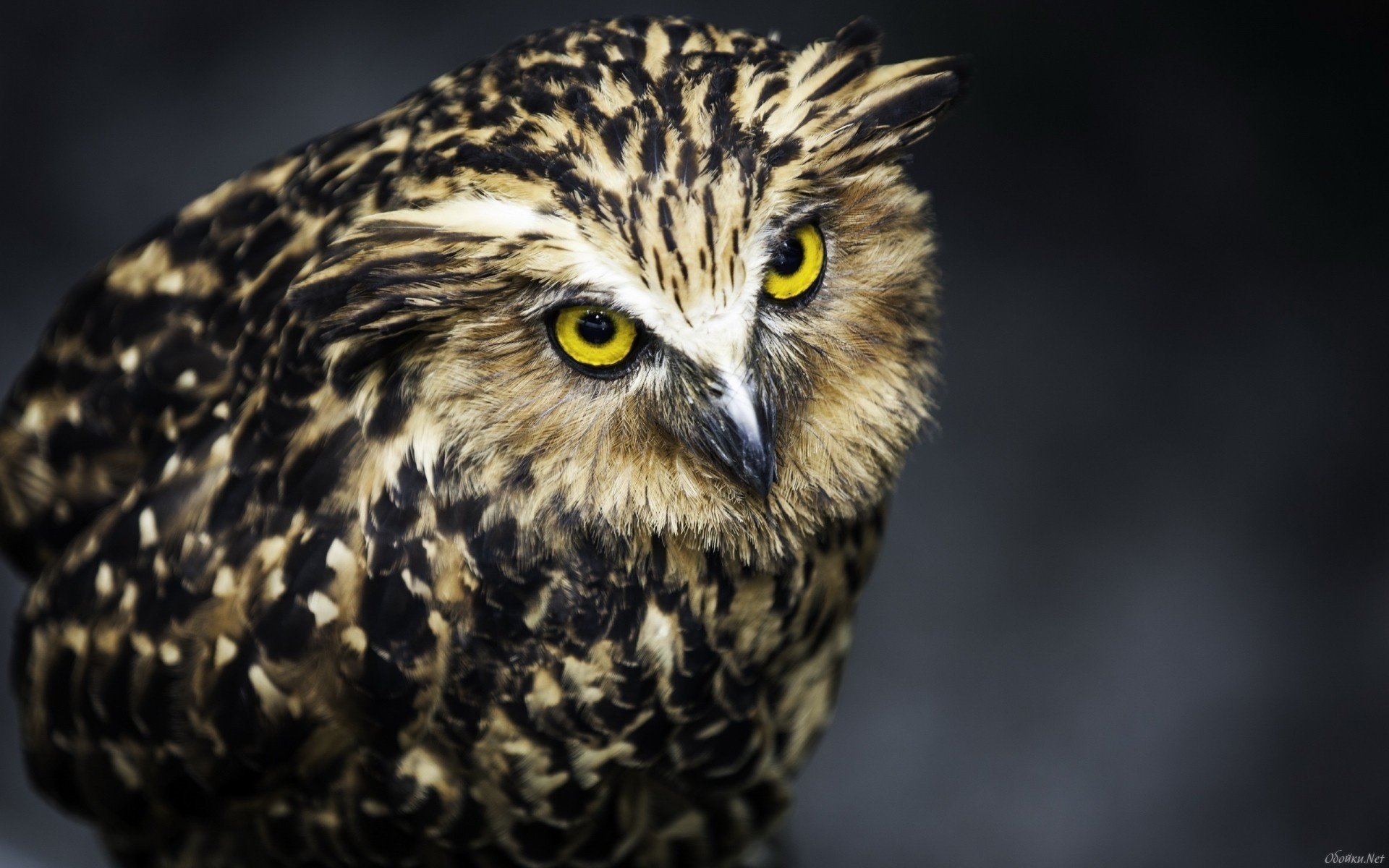 A mottled owl with yellow eyes