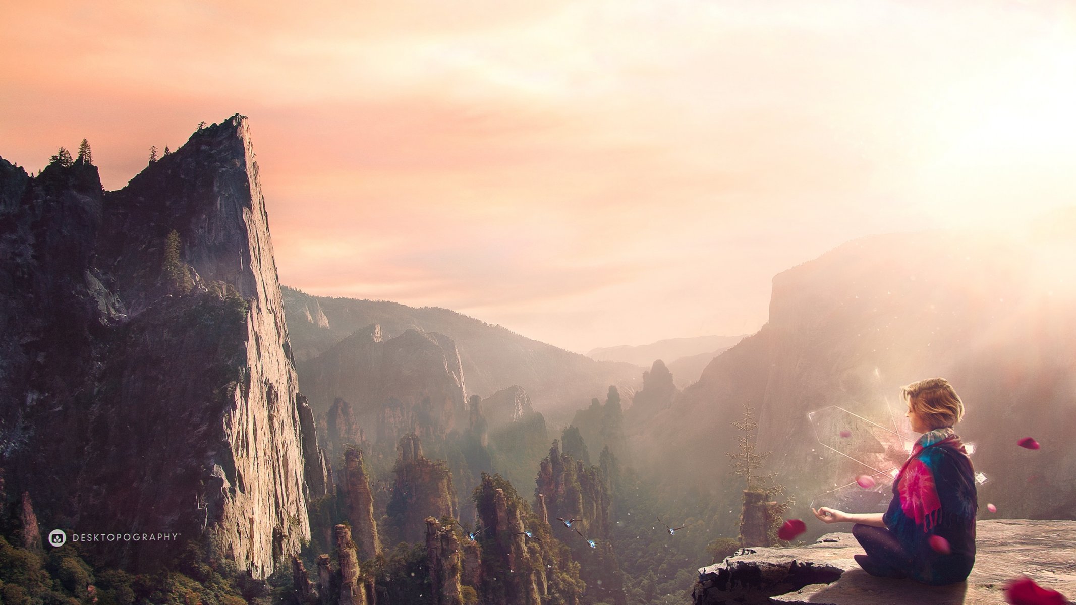A woman meditates in the high mountains