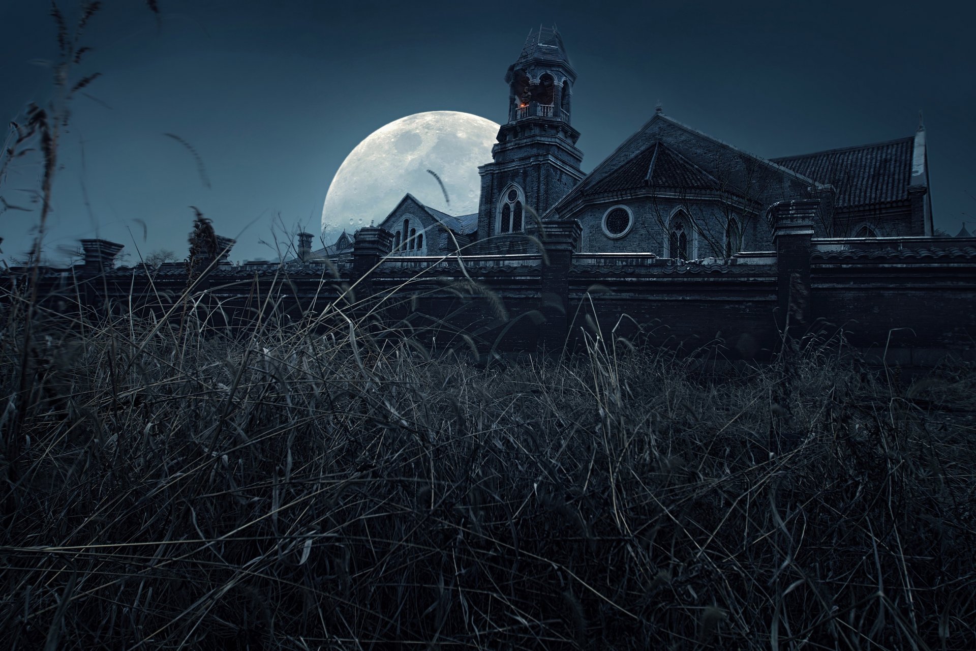 A haunted house on Halloween and a castle on the background of the sky with a full moon with scary clouds is creepy