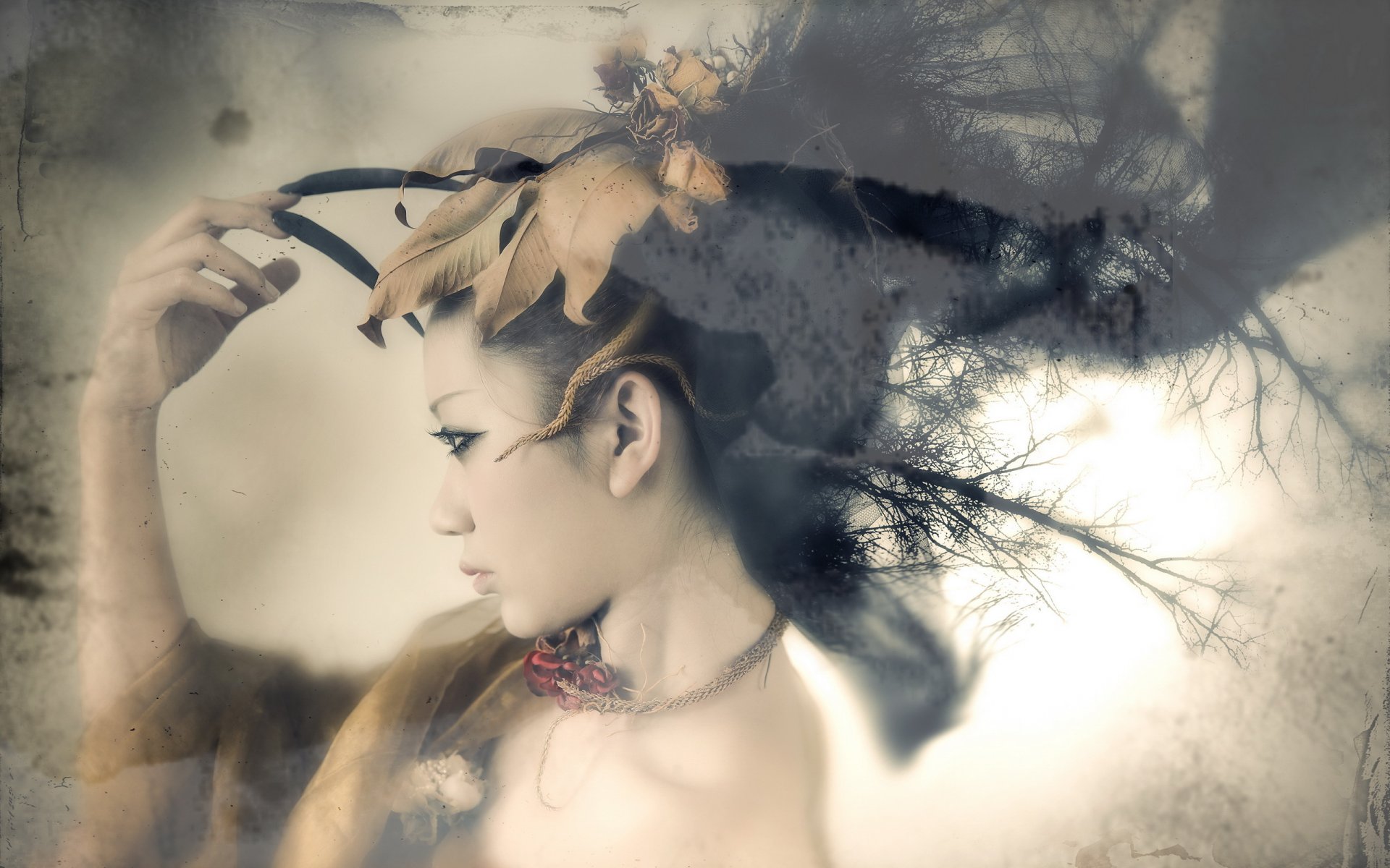 The girl is alone at night in the forest. lily petals develop in the windThe girl is alone at night in the forest. Lily petals develop in the wind