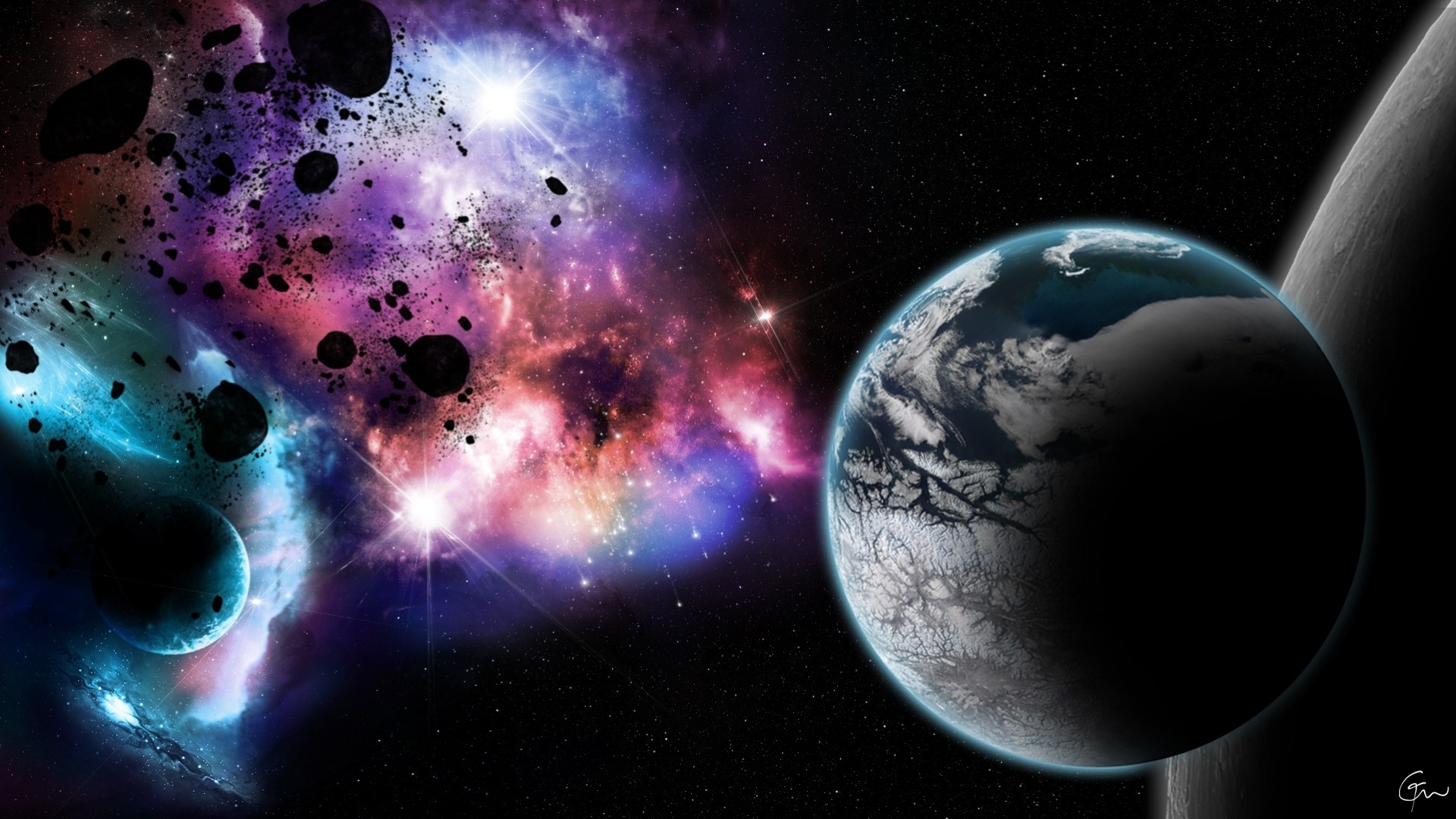 Asteroids fly around the planet against the background of nebulaeAsteroids fly around the planet against the background of nebulae