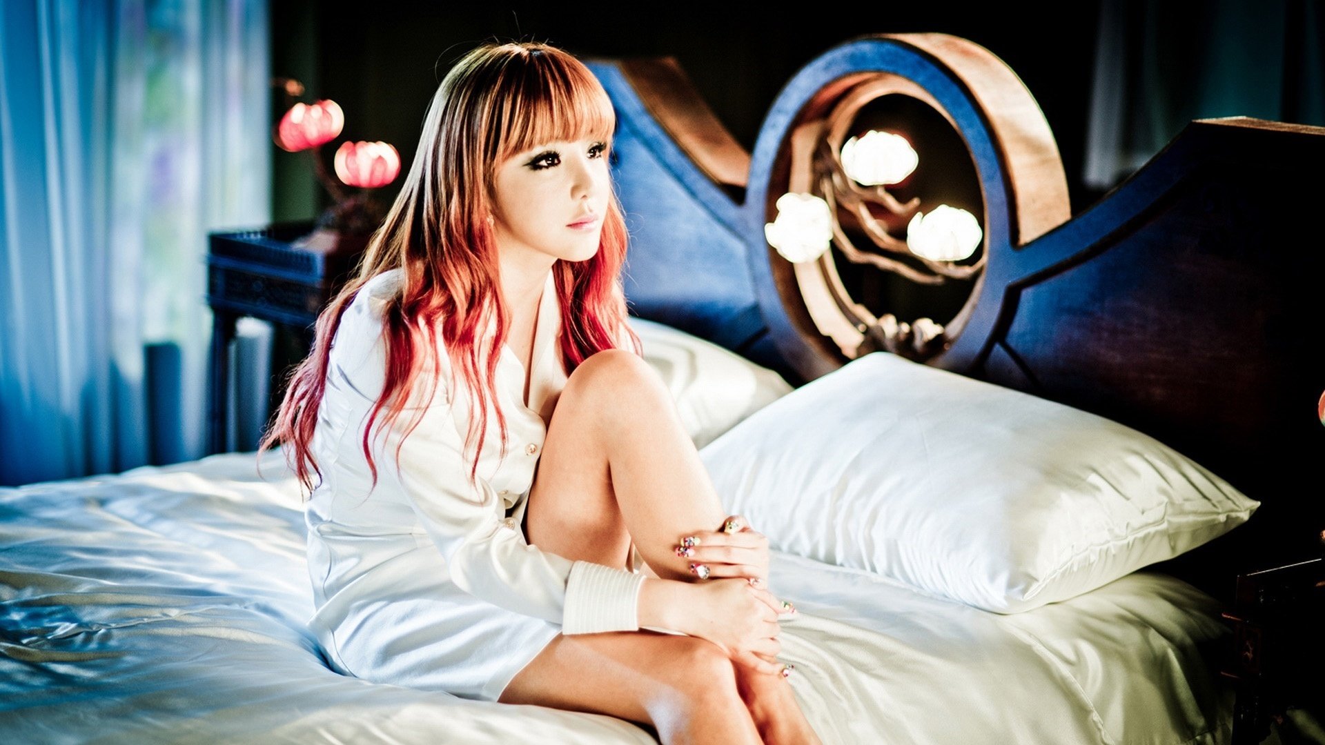Asian girl in a nightgown on a bed surrounded by lightsAsian girl in a nightgown on a bed surrounded by lights