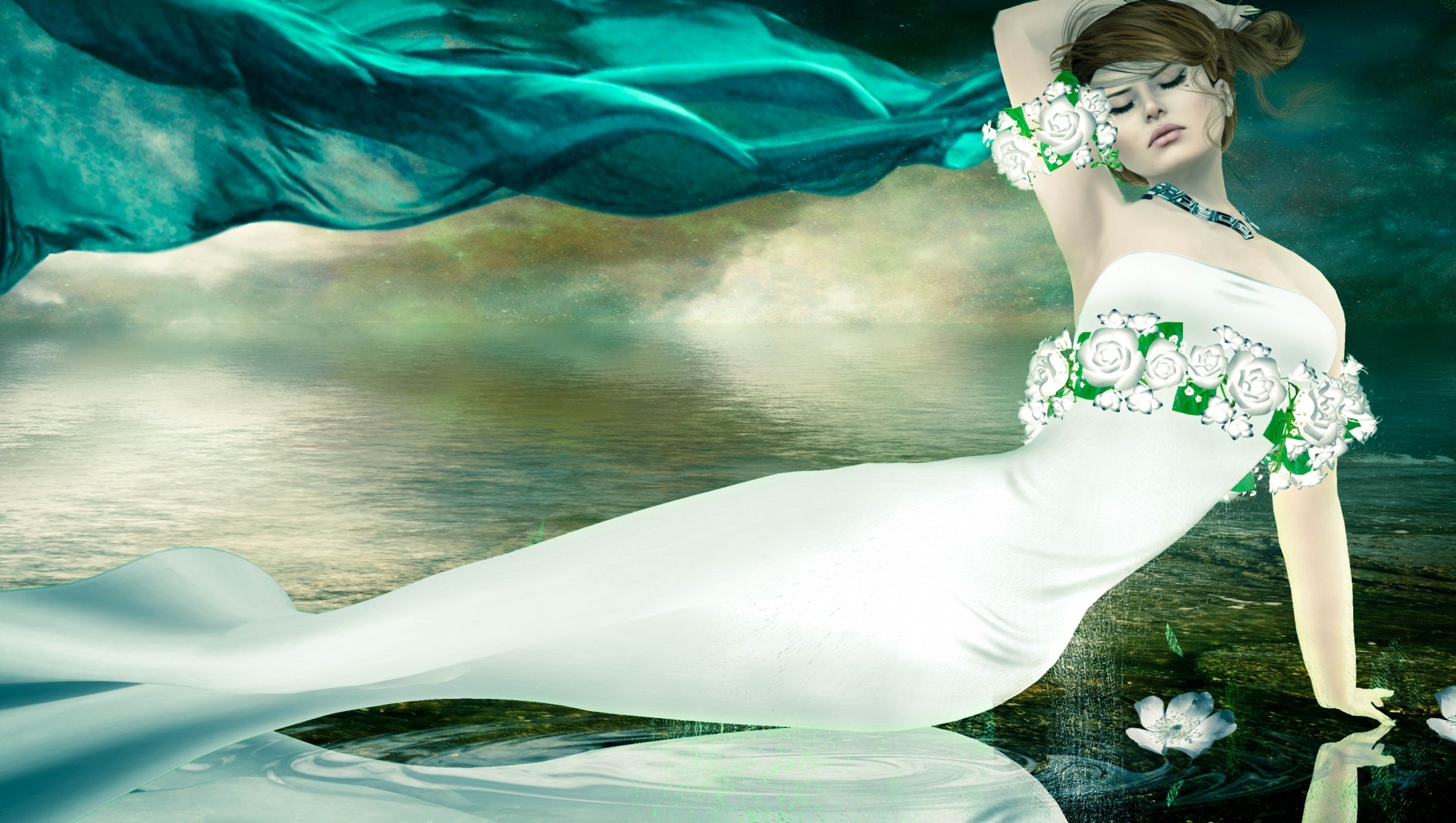 A girl in a white dress sitting on the rocks with an apple in her handA girl in a white dress sitting on the rocks with an apple in her hand