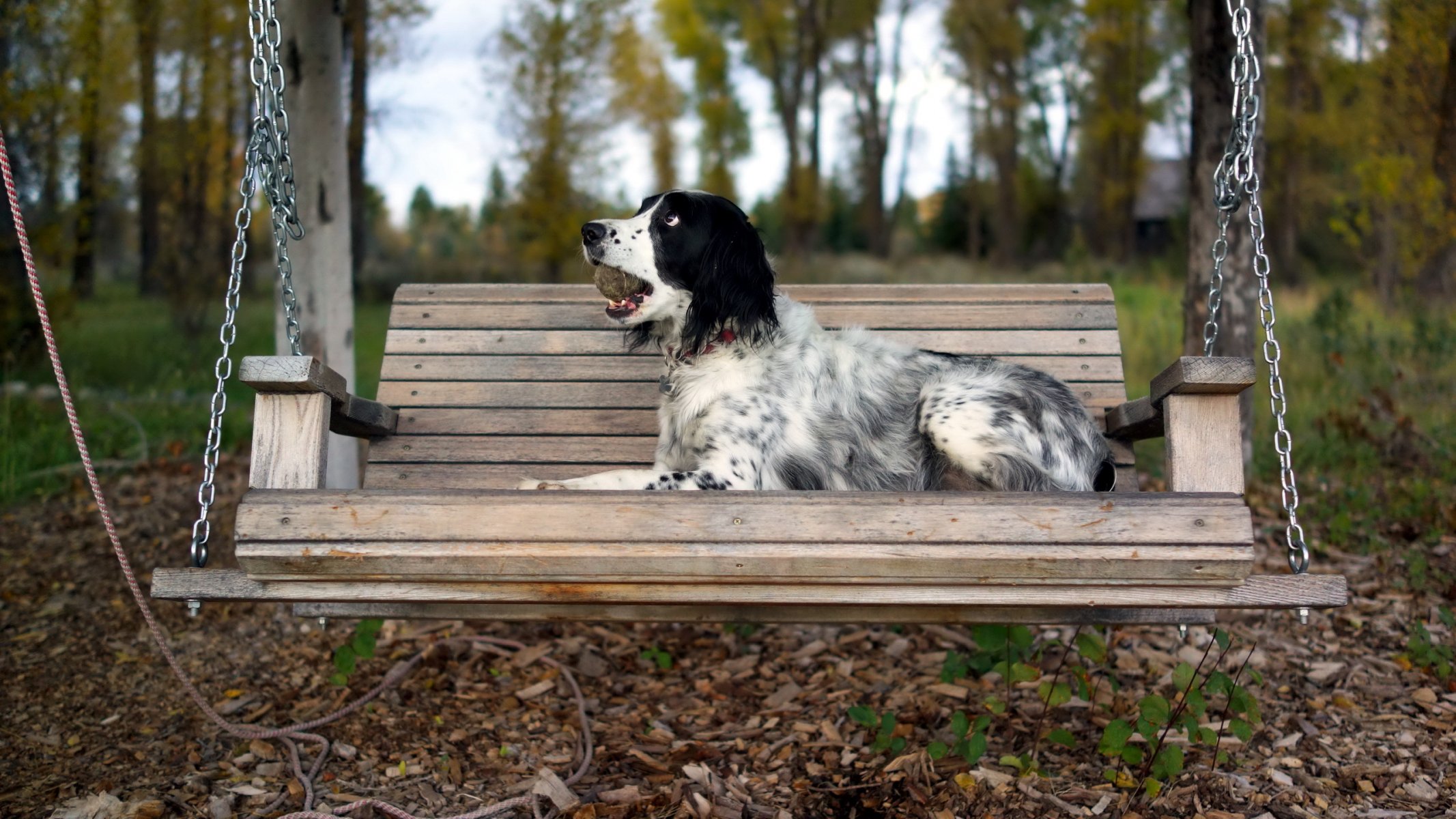 A dog lying on a swing with a toy in its teeth