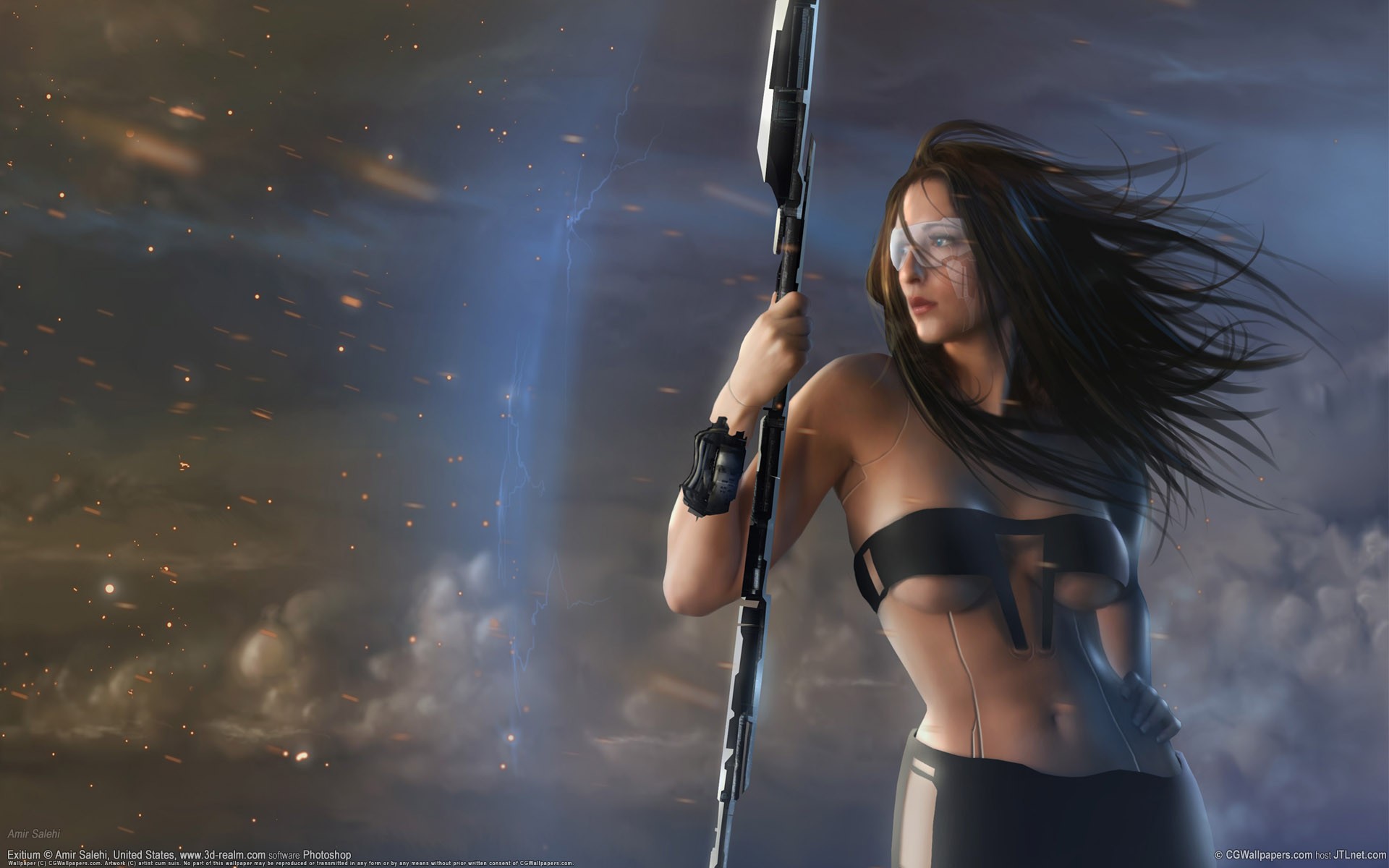 A beautiful warrior girl with a weapon on the background of cloudsA beautiful warrior girl with a weapon on the background of clouds