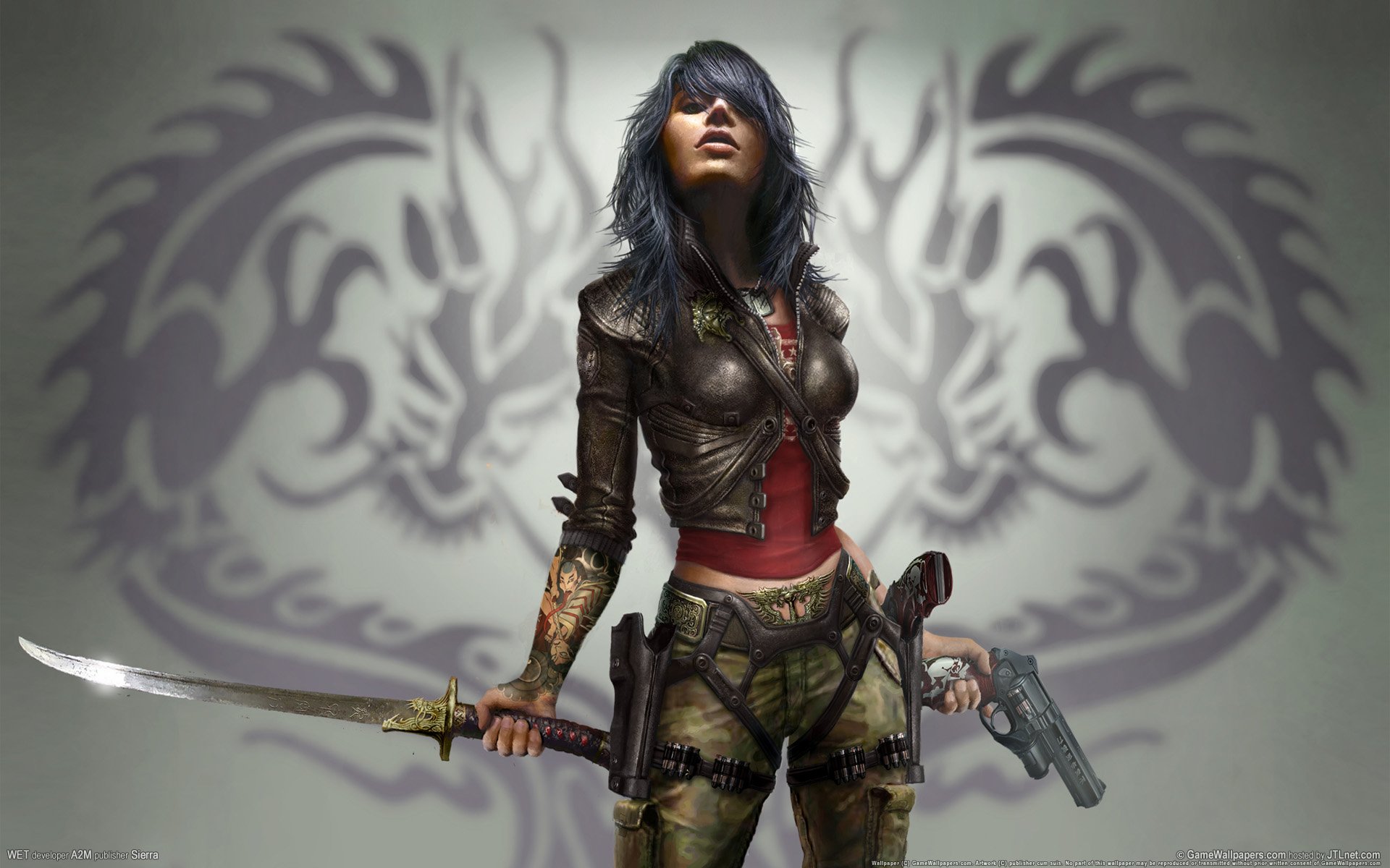 A pretty slender girl with a sword and a pistol