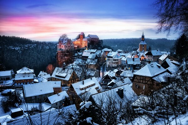 Snow-covered Christmas trees in the glow of sunset on a winter evening