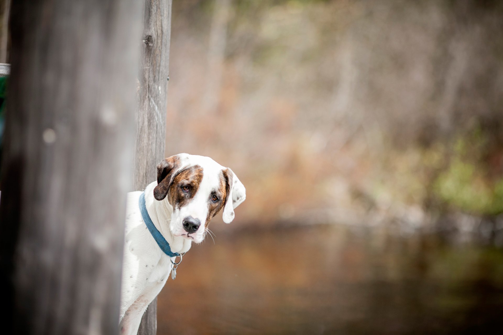 A boy with rabbit ears stands under a sign with a dog in the woods