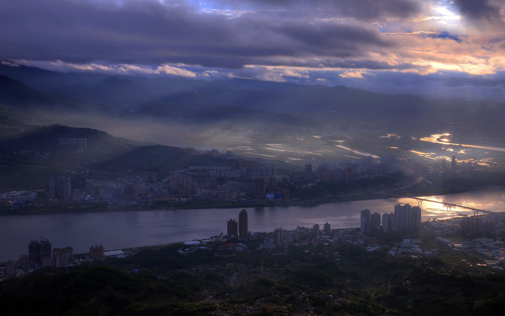 A big city in the darkness of clouds