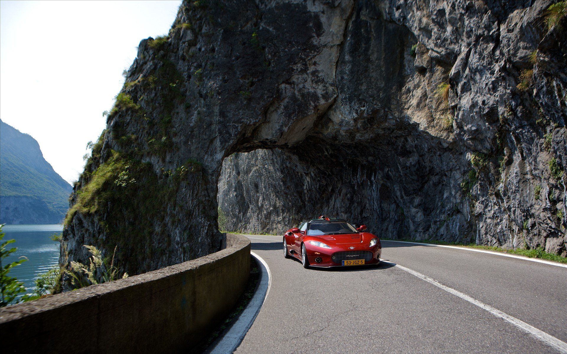 A red car on the road passes an arch