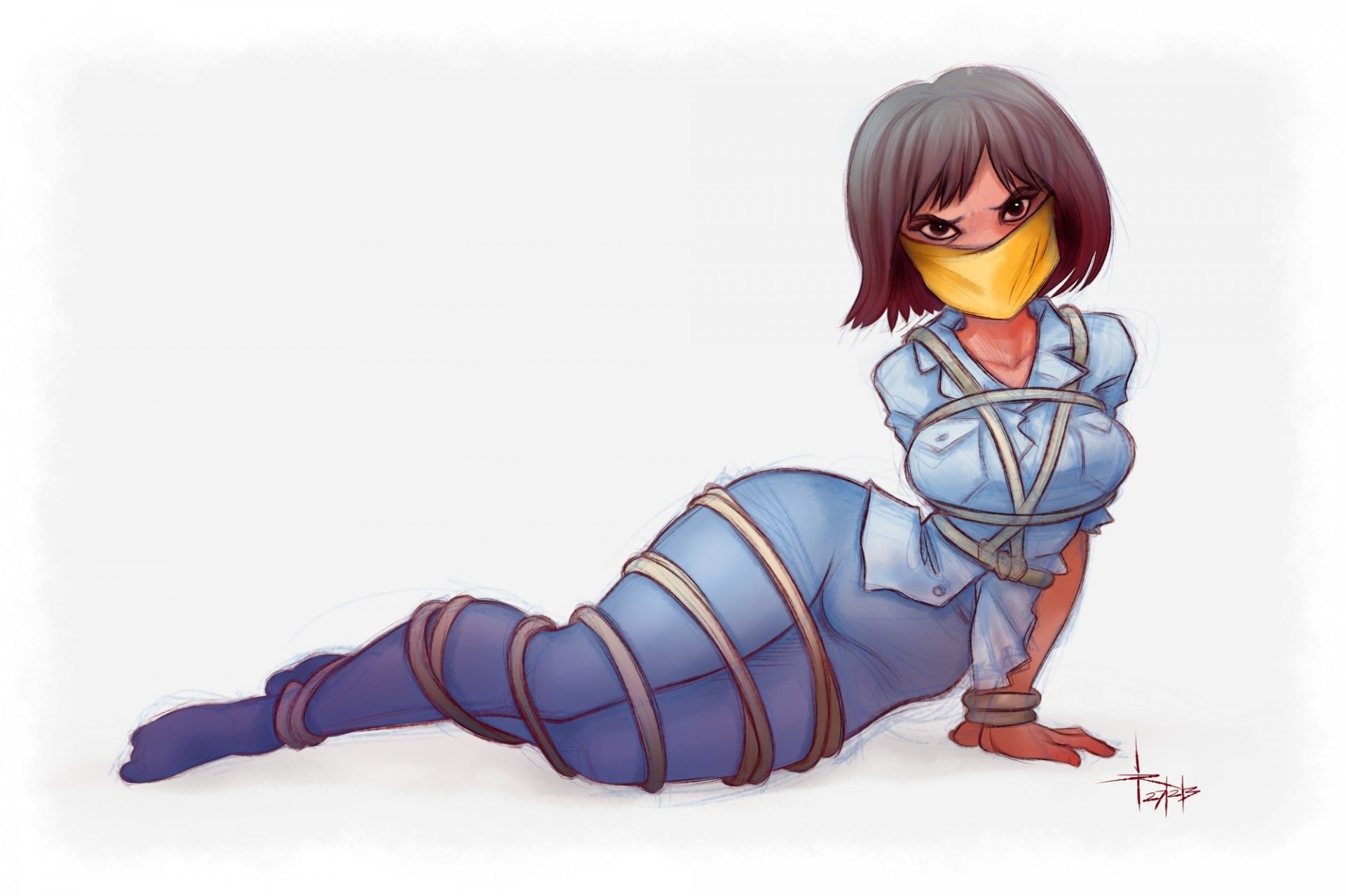 On a red and black background sits a bound girl with black hair in a white shirtOn a red and black background sits a bound girl with black hair in a white shirt