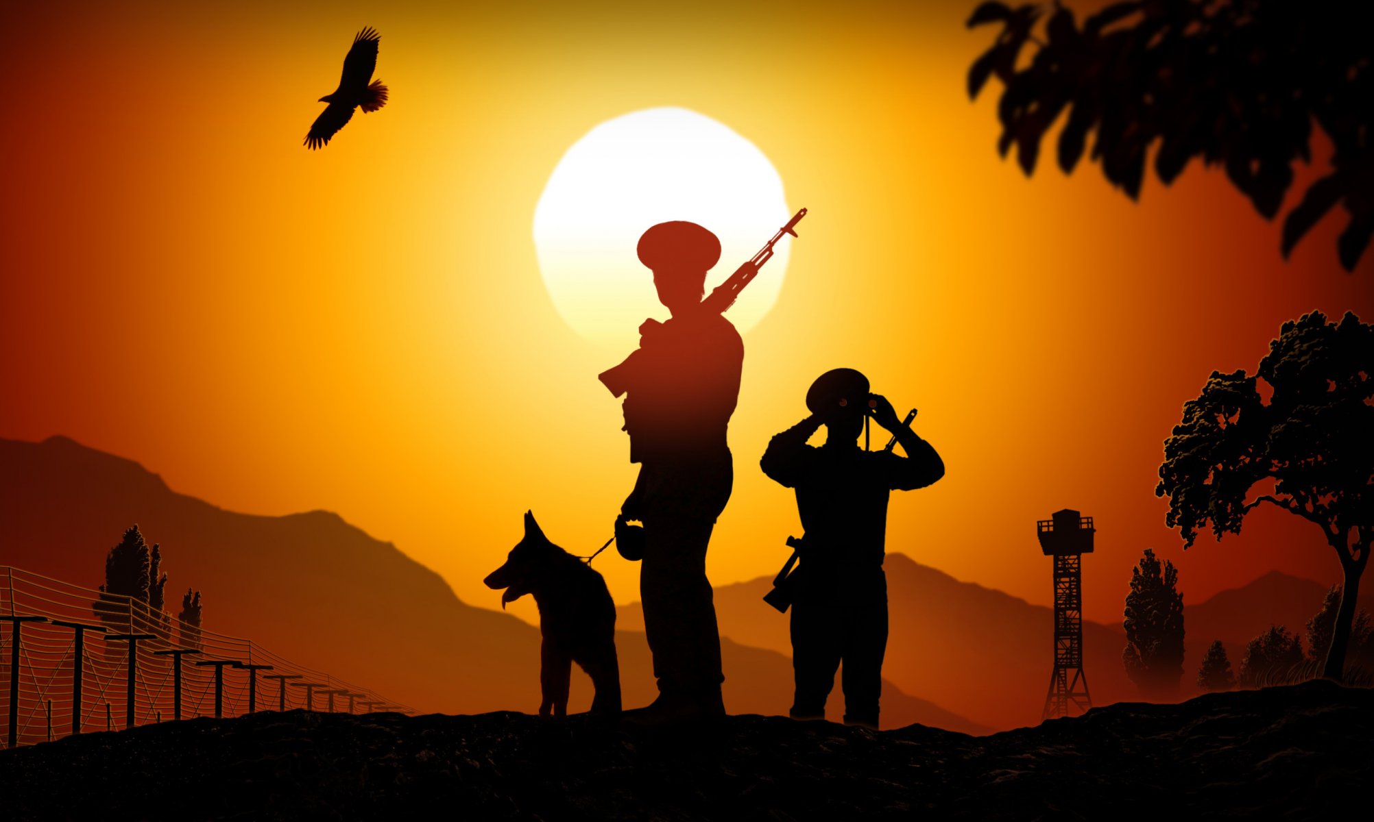art soldiers border guards on border strip silhouettes in sunset border lock key pocket